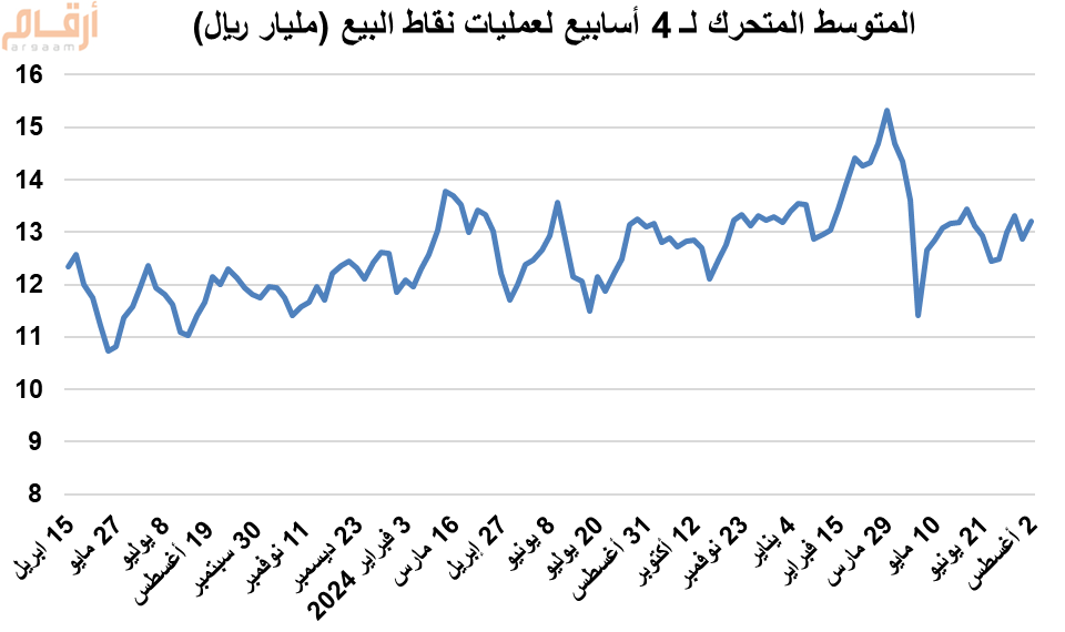 وبلغ المتوسط المتحرك لـ 4 أسابيع نحو 13.2 مليار ريال، وكان قيمة عمليات نقاط البيع قد ارتفعت خلال عام 2024 مقارنة بعامي 2023 و2022، حيث تراوح متوسط قيمة المبيعات بين 11 و14 مليار ريال، فيما كان يتراوح بين 10 و13 مليار ريال في عام 2023 وما بين 9 و12 مليار ريال في عام 2022، كما يوضح الرسم التالي: