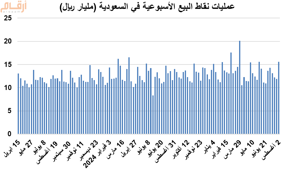 بلغت قيمة المبيعات عبر نقاط البيع في السعودية، نحو 15.6 مليار ريال خلال الأسبوع المنتهي في 2 أغسطس 2025، مقارنة بنحو 11.9مليار ريال خلال الأسبوع الذي سبقه.